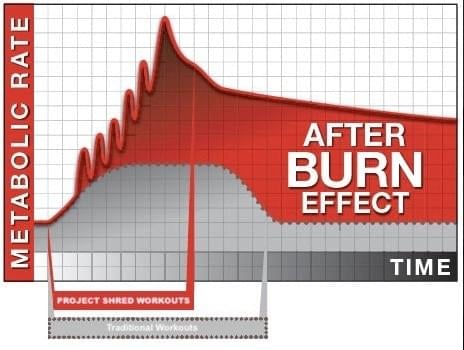 Project Shred utilizes a specific style of training that is meant to cause EPOC (Excess Post-Exercise Oxygen Consumption). This means that the specific exercises and the intensity of the workout has forced you to consume more oxygen. This increases your metabolic rate for 24 hours or more.